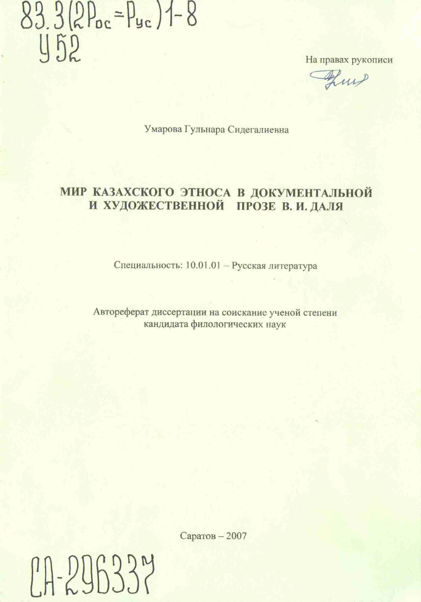 Мир казахского этноса в документальной и художественной прозе В.И. Даля : спец.: 10.01.01 - Русская литература: автореф. дис. на соиск. уч. ст. канд. филол. наук / Г.С. Умарова. - Саратов : [б. и.], 2007. - 18 с.