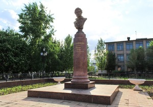 Бюст А. С. Пушкина в селе Черноречье 1987 г. С эпиграфом Ф. Тютчева «тебя ж, как первую любовь, - России сердце не забудет!».
